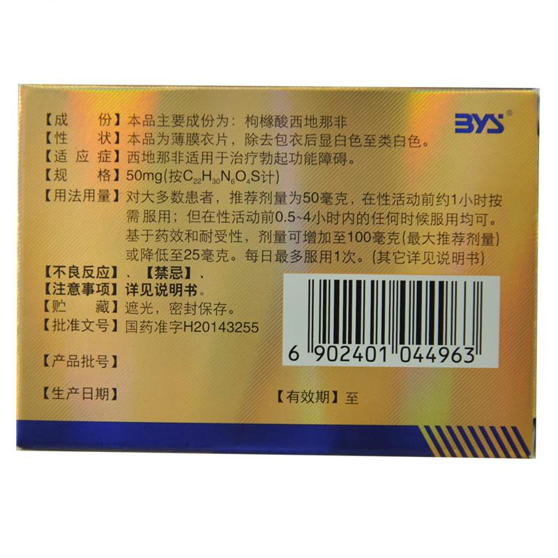 【注意事项】西地那非-硝酸酯类影响血压的相互作用,可从给药开始持续到整个6小时的观察期内。所以,在任何情况下,联合给予西地那非和有机硝酸酯类或提供NO类药物(如硝普钠)均属禁忌。以下患者慎用西地那非:阴茎解剖畸形(如阴茎偏曲、海绵体纤维化、Peyronie氏病),易引起阴茎异常勃起的疾病(如镰状细胞性贫血、多发性骨髓瘤、白血病)。其他治疗勃起功能障碍的方法与本品合用的安全性和有效性尚未研究,不推荐联合使用。在已有心血管危险因素存在时,用药后性活动有发生非致命性/致命性心脏事件的危险。在性活动开始时如出现心绞痛、头晕、恶心等症状,须终止性活动。国外批准本品上市后,有少量勃起时间延长(超过4小时)和异常勃起(痛性勃起超过6小时)的报告。如持续勃起超过4小时,患者应立即就诊。如异常勃起未得到即刻处理,阴茎组织将可能受到损害并可能导致永久性勃起功能丧失。西地那非对性传播疾病无保护作用。