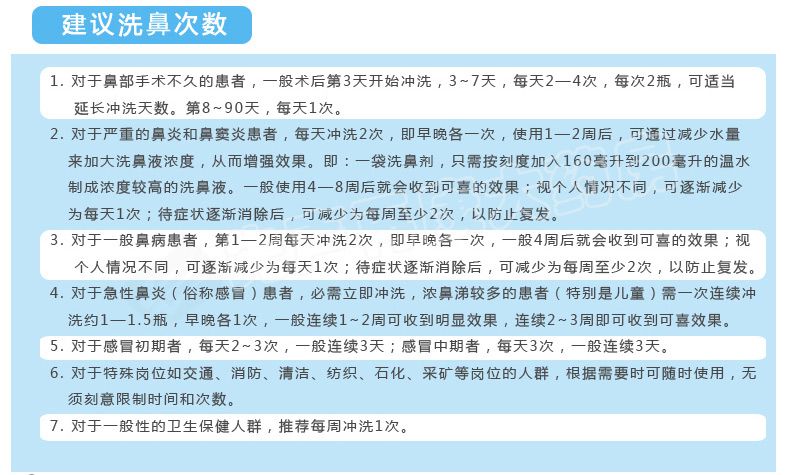 请仔细阅读说明书或在医务人员的指导下购买和使用。 【产品名称】 鼻可乐鼻腔清洗器 【规 格】 240ml+3.5g*10袋 (器+洗鼻剂10袋)【产品特点】 1.双正压反回流专利技术 2.不回流,不呛水 3.全面清洗鼻腔鼻窦 4.发明专利配方洗鼻剂 5.简单、安全、轻松、舒适 【适用范围】 1.用于鼻腔、鼻腔分泌物结痂清洗 2.萎缩性鼻炎药物清洗 3.鼻咽(癌)术后和化疗冲洗 4.清洗鼻部粘膜,避免因粘液在鼻腔的阻塞而导致感染,保护鼻腔粘膜 5.职业性吸入粉尘的鼻腔保健冲洗 【组 成】 1个洗鼻器 、10袋洗鼻剂 【使用方法】 1.加洁净的温水 2.加入洗鼻剂,水平移动摇匀 3.洗鼻 【批准文号】苏食药监械(准)字2011第2641167号 【生产厂家】 江苏泰德医药有限公司 |