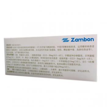 【用法用量】口服。剂量因人而异,一般推荐剂量2.5~20mg/日,早餐前30分钟服用。日剂量超过15mg,宜在早、中、晚分三次餐前服用。单用饮食疗法失败者:起始剂量一日2.5~5mg,以后根据血糖和尿糖情况增减剂量,每次增减2.5~5.0mg。一日剂量超过15mg,分2~3次餐前服用。已使用其他口服磺酰脲类降糖药者:停用其他磺酰脲药3天,复查血糖后开始服用本品。从5mg起逐渐加大剂量,直至产生理想的疗效。最大日剂量不超过30mg
