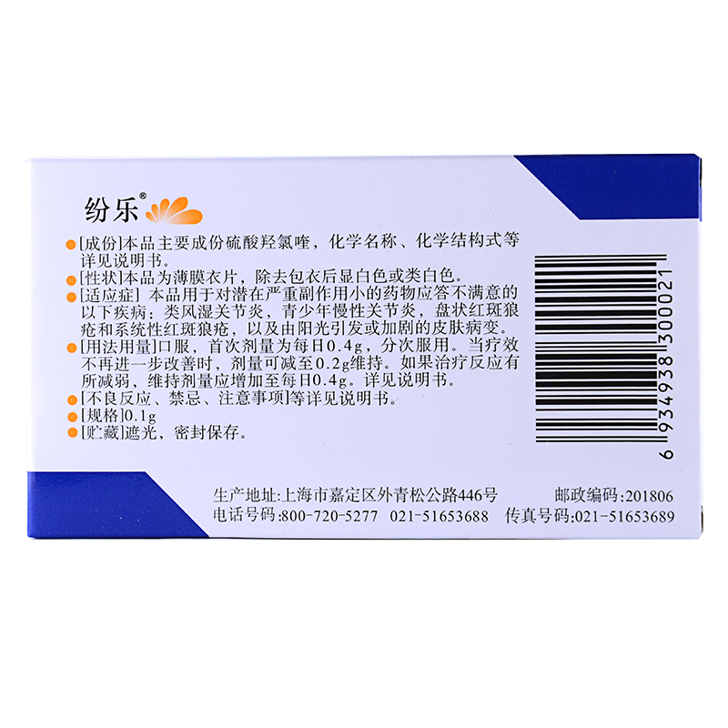 首页>全部商品>专科用药>风湿关节>类风湿性关节炎>纷乐 硫酸羟氯喹片 0.1g*14片/盒